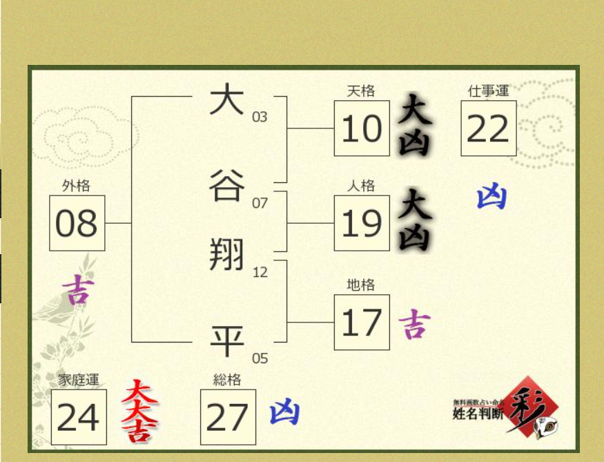 野球界で大活躍して契約金もすごいことになっている大谷選手の姓名判断がこれかよ(笑)当てになんないな~